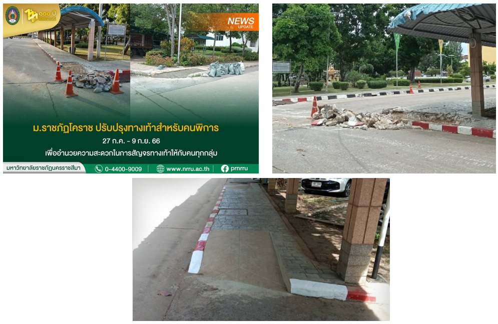 งานโยธาและสถาปัตย์ โครงการจัดตั้งกองอาคารสถานที่และบริการ สำนักงานอธิการบดี ได้ดำเนินการปรับปรุงทางเท้าสำหรับคนพิการ มหาวิทยาลัยราชภัฏนครราชสีมา โดยเริ่มทำการปรับปรุงตั้งแต่วันที่ 27 กรกฎาคม - 9 กันยายน 2566 เพื่ออำนวยความสะดวกในการสัญจรทางเท้าให้กับคนทุกกลุ่ม ซึ่งขณะนี้อยู่ระหว่างผู้รับจ้างดำเนินการรื้อถอนพื้นทางเท้าเดิม เตรียมเทคอนกรีตและงานทรายล้าง จึงทำให้เกิดความไม่สะดวกในการใช้ทางเท้าบริเวณโดยรอบมหาวิทยาลัย จึงแจ้งมาแจ้งเพื่อทราบ และขออภัยในความไม่สะดวกมา ณ ที่นี้