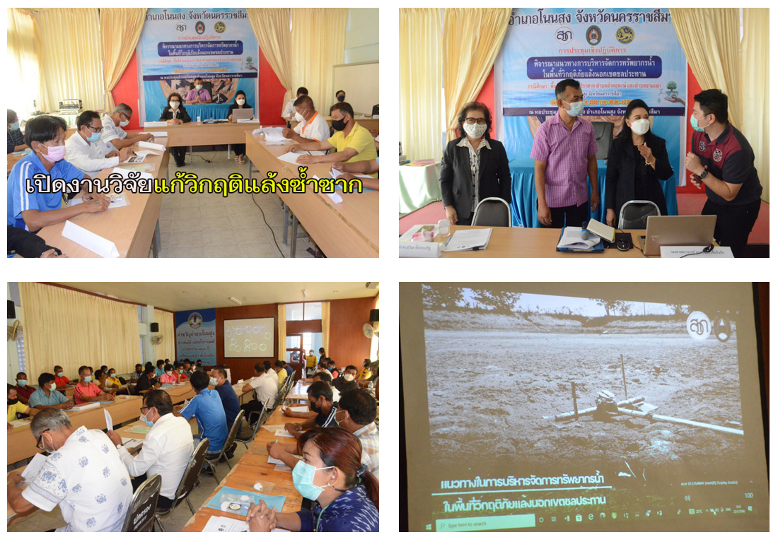 22 มี.ค.65 ที่ห้องประชุมที่ว่าการอำเภอโนนสูง จ.นครราชสีมา นายไพโรจน์ ปานสาคร ปลัดอาวุโสอำเภอโนนสูง ผู้แทนนายอำเภอโนนสูง พร้อมด้วย ผู้ช่วยศาสตราจารย์ ดร.วรัชยา เชื้อจันทึก หัวหน้าคณะผู้ดำเนินงานวิจัยเพื่อศึกษาและหาแนวทางในการแก้ไขปัญหาพื้นที่วิกฤตภัยแล้งที่เกิดขึ้นอย่างเร่งด่วน มหาวิทยาลัยราชภัฏนครราชสีมา, รศ.ดร.สุวิมล ตั้งประเสริฐ นักวิชาการ มหาวิทยาราชภัฏนครราชสีมา ร่วมประชุมและเปิดการประชุมสัมมนางานวิจัยเพื่อศึกษาและหาแนวทางในการแก้ไขปัญหาพื้นที่วิกฤตภัยแล้งที่เกิดขึ้นอย่างเร่งด่วน โดยมีหน่วยงาน ภาคส่วนที่เกี่ยวข้อง และผู้สนใจกว่า 60 คน ประกอบด้วย สำนักงานป้องกันและบรรเทาสาธารณภัยจังหวัดนครราชสีมา ผู้อำนวยการสำนักงานทรัพยากรน้ำภาค 5 ผู้อำนวยการสำนักงานชลประทานจังหวัดนครราชสีมา พัฒนาการอำเภอโนนสูง เกษตรอำเภอโนนสูง นายกองค์กรปกครองส่วนท้องถิ่น กำนัน ผู้ใหญ่บ้าน และประชาชนที่สนใจในเขตพื้นที่อำเภอโนนสูง เพื่อนำเสนอข้อมูลแนวทางการบริหารจัดการทรัพยากรน้ำเพื่อแก้ไขปัญหาวิกฤตภัยแล้ง แนวทางการบริหารจัดการทรัพยากรน้ำควรมีการบริหารจัดการน้ำแบบสมดุล โดยให้ความสำคัญต่อลำน้ำสาขาเทียบเท่าลำน้ำหลักเพื่อเพิ่มผลิตภาพของน้ำเชิงพื้นที่ การประเมินความเสี่ยงอุทกภัยและภัยแล้งทั้งมิติเชิงกายภาพและสังคม เพื่อลดผลกระทบภายใต้มาตรการเชิงโครงสร้างและไม่ใช่โครงสร้าง โดยการมีส่วนร่วมของทุกภาคส่วน เพื่อการพัฒนาแบบองค์รวมอย่างยั่งยืน การนำเสนอข้อมูลในครั้งนี้จะเป็นประโยชน์ต่อชุมชนในพื้นที่และหน่วยงานที่เกี่ยวข้องสามารถนำผลการวิจัยไปเป็นแนวทางในการกำหนดนโยบาย การจัดทำแผนปฏิบัติการการบริหารจัดการทรัพยากรน้ำในพื้นที่วิกฤตภัยแล้งนอกเขตชลประทานของจังหวัดนครราชสีมาและในพื้นที่อื่นๆ อย่างเหมาะสมต่อไป