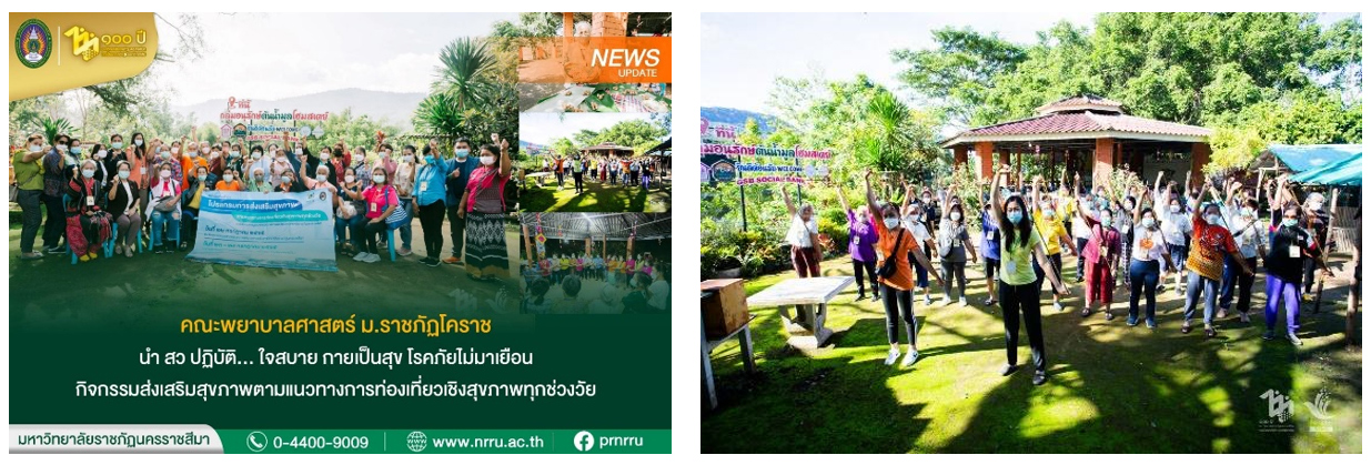 เพื่อเป็นการป้องกันปัญหาสุขภาพและส่งเสริมให้ผู้สูงอายุได้ดูแลตนเอง จัดกิจกรรมส่งเสริมสุขภาพตามแนวทางการท่องเที่ยว บ้านสุขสมบูรณ์ ต.ไทยสามัคคี อ.วังน้ำเขียว จ.นครราชสีมา กิจกรรมประกอบด้วย การบรรยายเรื่องโภชนาการอาหาร การออกกำลังกาย กิจกรรมการอยู่ร่วมกันของคนกับป่าตามแนวทางของชุมชน กิจกรรมพัฒนาจิต เป็นต้น ซึ่งผู้เข้าร่วมกิจกรรมเกิดความสุข มีความรู้ด้านการดูแลตนเอง