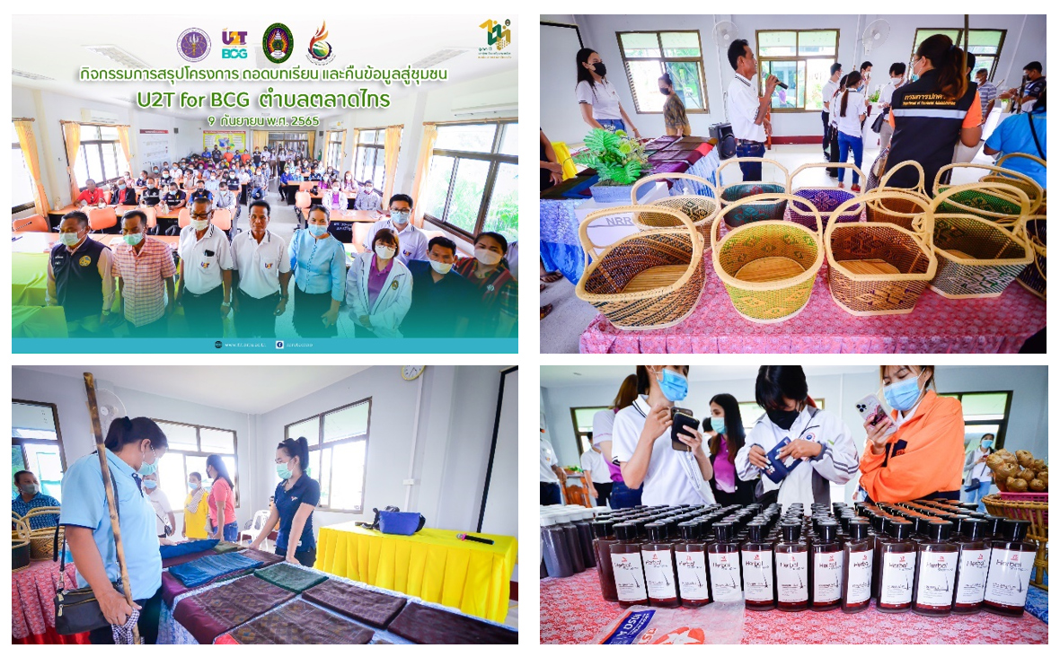 วันที่ 9 กันยายน 2565 ผู้ช่วยศาสตราจารย์ ศราวุฒิ ใจอดทน ผู้จัดการโครงการ และอาจารย์รัฐพล ปัญจอาภรณ์ เลขานุการโครงการ จัดกิจกรรมสรุปโครงการ ถอดบทเรียน และคืนข้อมูลสู่ชุมชน เพื่อรายงานผลการดำเนินโครงการ และถอดบทเรียน ให้แก่ผู้บริหารองค์การบริหารส่วนตำบลตลาดไทร กลุ่มผู้นำชุมชน ประชาชนในพื้นที่ รวมถึงกลุ่มแชมพูสมุนไพรตำบลตลาดไทร และกลุ่มทำไม้กวาดจากขวดพลาสติกตำบลตลาดไทร และในงานยังมีการจัดจำหน่ายผลิตภัณฑ์ชุมชนที่ได้รับการพัฒนาจากโครงการ ซึ่งในการดำเนินโครงการครั้งนี้ ได้มุ่งเน้นในการพัฒนาทักษะอาชีพ การพัฒนาผลิตภัณฑ์ที่ใช้ทรัพยากรจากท้องถิ่น การพัฒนาบรรจุภัณฑ์ และการออกแบบตราสินค้าเพื่อสร้างมูลค่าเพิ่มให้แก่ผลิตภัณฑ์ของกลุ่มแชมพูสมุนไพรตำบลตลาดไทร และกลุ่มทำไม้กวาดจากขวดพลาสติกตำบลตลาดไทร สอดคล้องกับแนวทางการพัฒนาเศรษฐกิจฐานรากของชุมชนด้วยเศรษฐกิจ BCG (BCG Economy) ในงานมี นายสุวิชญ์ ห้อยไธสง นายกองค์การบริหารส่วนตำบลตลาดไทร พร้อมด้วยผู้บริหารองค์การบริหารส่วนตำบลตลาดไทร คณาจารย์และบุคลากรคณะเทคโนโลยีอุตสาหกรรม เข้าร่วมกิจกรรมในครั้งนี้ โดยจัดขึ้น ณ ห้องประชุมองค์การบริหารส่วนตำบลตลาดไทร ตำบลตลาดไทร อำเภอประทาย จังหวัดนครราชสีมา