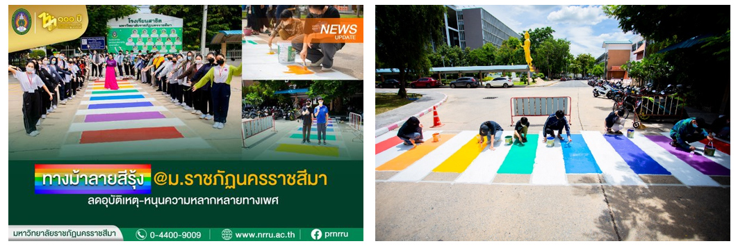 มหาวิทยาลัยราชภัฏนครราชสีมา รณรงค์เรื่องความเท่าเทียมกันเรื่องเพศสภาพ กับความปลอดภัยจราจร โดยจัดทำ “ทางม้าลายสีรุ้ง” หวังให้ผู้ใช้รถใช้ถนนภายในมหาวิทยาลัยสะดุดตา ต้องชะลอหรือจอดให้คนข้าม ยังส่งเสริมเรื่องความเท่าเทียมทางเพศ ของกลุ่ม LGBTQ ซึ่งทางม้าลายสีรุ้งนี้ เริ่มต้นจัดทำ 2 จุด คือ บริเวณหน้าโรงเรียนสาธิตฯ และบริเวณหน้าเรือนโคราช เป็นความร่วมมือร่วมใจของ คณาจารย์ นักศึกษาสาขาวิชาศิลปศึกษา และสาขาวิชานาฏศิลป์ไทย คณะครุศาสตร์ ทางม้าลายสีรุ้งนี้ ถือเป็นการแสดงออกเชิงสัญลักษณ์ ว่า มหาวิทยาลัยราชภัฏนครราชสีมา ปัจจุบันมหาวิทยาลัยได้สร้างห้องน้ำเฉพาะให้นักศึกษา LGBTQ พร้อมออกประกาศเรื่อง แนวปฏิบัติต่อนักศึกษาและการแต่งกายของนักศึกษาที่มีอัตลักษณ์ทางเพศหรือวิถีทางเพศไม่ตรงกับเพศกำเนิด พร้อมที่จะสนับสนุนความเท่าเทียมของกลุ่มบุคคลที่มีความหลากหลายทางเพศ โดยการเคารพและเห็นคุณค่าของความหลากหลายทางเพศ (LGBTQ) เป็นความสำคัญ