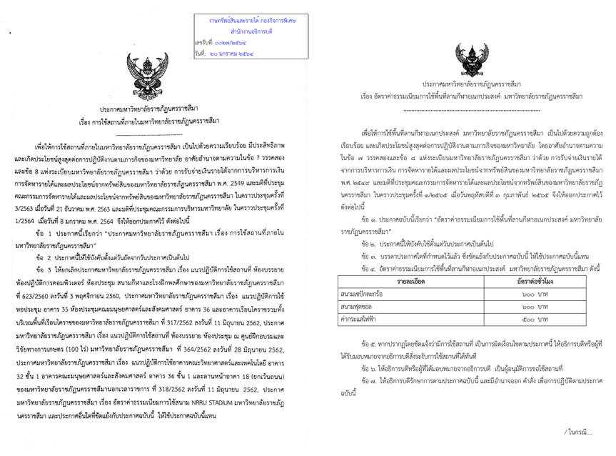 มหาวิทยาลัยราชภัฏนครราชสีมา จัดให้บุคคลทั่วไปเข้าถึงพื้นที่เปิดโล่งและพื้นที่สีเขียวได้โดยไม่มีค่าใช้จ่าย โดยมีสนาม NRRU Stadium เพื่อให้บุคลากร นักศึกษา และประชาชนทั่วไปสามารถมาออกกำลังกาย เดิน วิ่งได้ฟรี แต่หากมีการจัดกิจกรรมอื่นจะมีค่าใช้จ่ายตาม ประกาศมหาวิทยาลัยราชภัฏนครราชสีมา เรื่อง อัตราค่าธรรมเนียมการใช้พื้นที่ลานกีฬาอเนกประสงค์ มหาวิทยาลัยราชภัฏนครราชสีมา และประกาศมหาวิทยาลัยราชภัฏนครราชสีมา เรื่อง การใช้สถานที่ภายในมหาวิทยาลัย โดยสามารถติดต่อได้ที่ งานทรัพย์สินและรายได้ สำนักงานตั้งอยู่ที่ อาคารศูนย์ฝึกประสบการณ์วิชาชีพทับแก้ว ชั้น 1 มหาวิทยาลัยราชภัฏนครราชสีมา